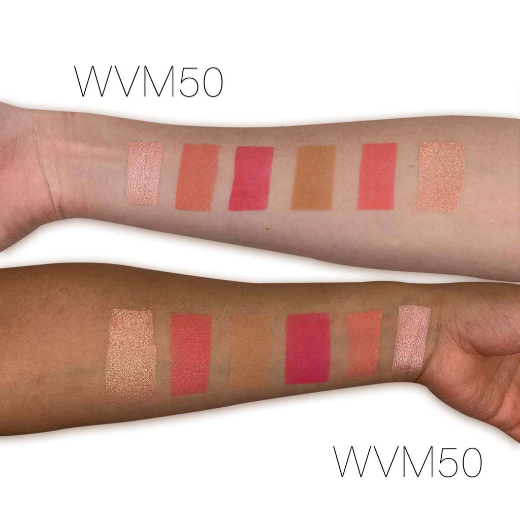 WVM50 (Universal) 2 Highlighters in Pearly Pink, Soft Peach, 1 Contour in Golden Sand and 3 Blushes in Rosy Pink, Delicate Peach, Bright Fuchsia Pink